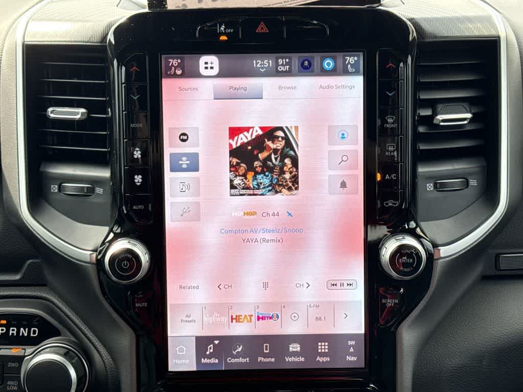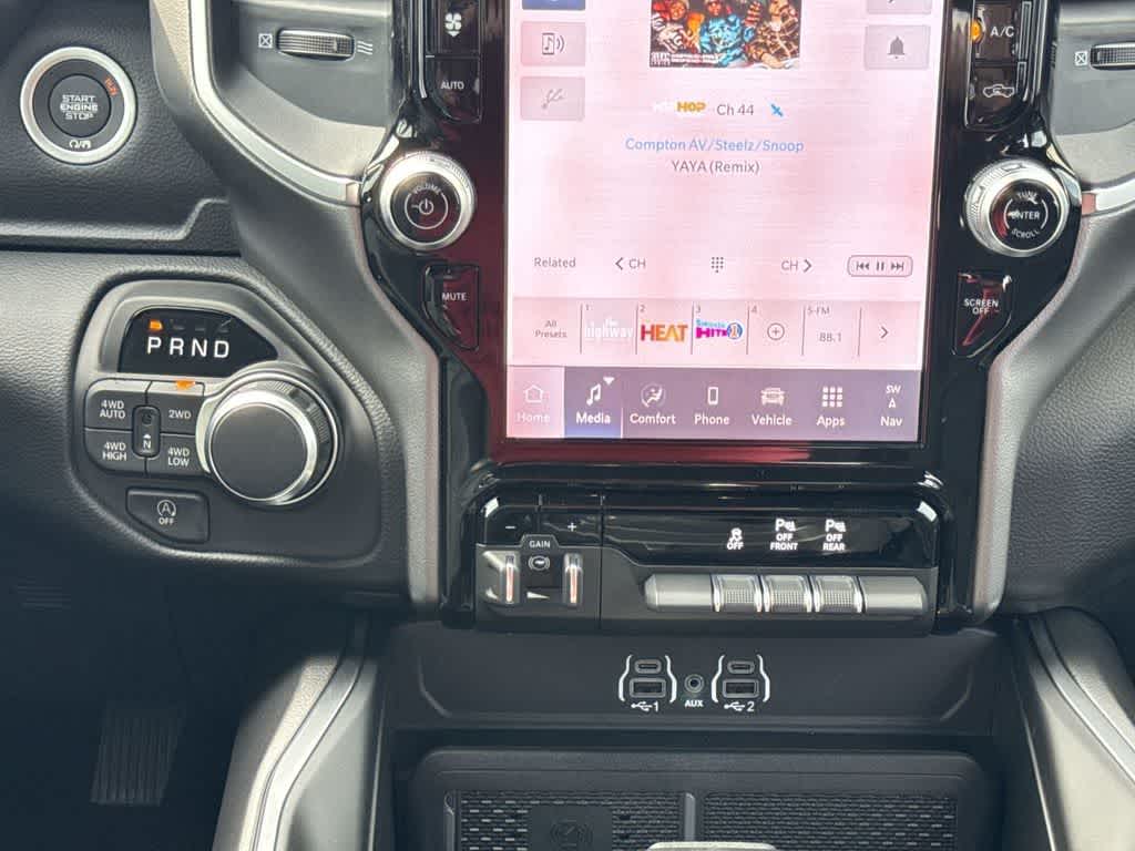 BIG HORN LEVEL 2 EQUIPMENT GROUP SiriusXM Radio Service, Power Adjustable Pedals, Leather Wrapped Steering Wheel, 12 Touchscreen Display, Glove Box Lamp, Auto Power-Folding Mirrors, 115V Auxiliary Rear Power Outlet, Media Hub w/2 Charge Only USBs, Heated Front Seats, Security Alarm, Black Premium Power Mirrors, Premium Overhead Console, 9 Amplified Speakers w/Subwoofer, Disassociated Touchscreen Display, Body Color Fender Flares, Remote Tailgate Release, 115V Auxiliary Power Outlet, LED Dome Lamp w/On/Off Switch, Universal Garage Door Opener, 2nd Row In Floor Storage Bins, Sun Visors w/Illuminated Vanity Mirrors, LED Footwell Lighting, Rear Window Defroster, Rear View Auto Dim Mirror, Rear Power Sliding Window, GPS Navigation, Overhead LED Lamps, Wheels: 20 x 9 Aluminum Chrome Clad, ENGINE: 5.7L V8 HEMI MDS VVT ETORQUE Active Noise Control System, Heavy Duty Engine Cooling, Passive Tuned Mass Damper, GVWR: 7,100 lbs, Dual Rear Exhaust w/Bright Tips, G/T Exhaust, 18 Aluminum Spare Wheel, NIGHT EDITION Tires: 275/55R20 OWL All Season, Bridgestone Brand Tires, Accent Color Premium Power Mirrors, Exterior Mirrors w/Supplemental Signals, Black Headlamp Bezels, Exterior Mirrors Courtesy Lamps, Grille Black Surround Black Mesh, Auto Power-Folding Mirrors, Wheels: 20 x 9.0 Aluminum Painted Clad, Auto Dim Exterior Driver Mirror, Black Exterior Truck Badging, Anti-Spin Differential Rear Axle, Accent Color Door Handles, Accent Color Tailgate Handle, Black Interior Accents, Dual Exhaust w/Black Tips, Body Color Front Bumper, Body Color Rear Bumper w/Step Pads, Black Tail Lamp Bezels, RAM Grille Badge - Black, Black Painted Exterior Mirrors Caps, MOPAR BLACK TUBULAR SIDE STEPS, TRANSMISSION: 8-SPEED AUTOMATIC (8HP75).